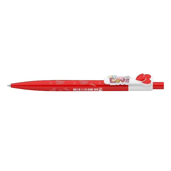 Nyomógombos mechanikával működő golyóstoll, amelyen szívecskés motívumok díszítik tolltestet és LOVE feliratú nyomat a klipszet. Cserélhető X-20-as kék színű golyósbetéttel. Írásvonalvastagság: 0,8 mm.
