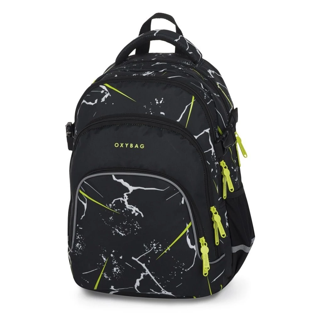 Az OXY Scooler hátizsák ideális választás 3. osztálytól azoknak, akiknek minden fontos dolognak helyet kell találniuk. A háromrekeszes kialakítás bőséges teret kínál tankönyveknek, füzeteknek és uzsonnának. Beépített rendszerező, belső zseb és laptoprekesz is található benne. Az oldalzseb tökéletes kulacsnak, a kulcs- vagy chip-tartó pedig megkímél a keresgéléstől. Az anatómiailag formázott, légáteresztő hátrész, az állítható vállpántok és a mellkaspánt hosszabb viselésnél is kényelmet biztosítanak. A megerősített, vízálló alj védi a tartalmat a nedvességtől, a fényvisszaverő elemek pedig növelik a biztonságot. Űrtartalom: 28 l, teherbírás: 8 kg.