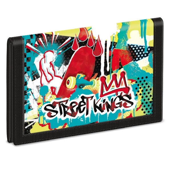 Tépőzáras pénztárca, hátulján cipzáros zsebbel az aprópénznek. Belsejében papírpénz-, valamint bérlet- és kártyatartó rekesszel. Összehajtható. Tartós, dupla varrású szegéllyel.