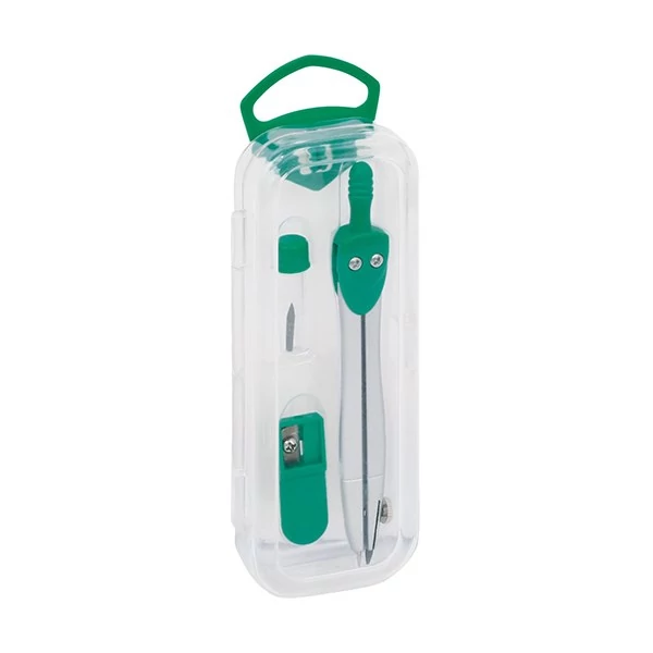 Fém iskolai körző, heggyel, és hegyezővel, formatervezett dobozban, vegyes színekben.