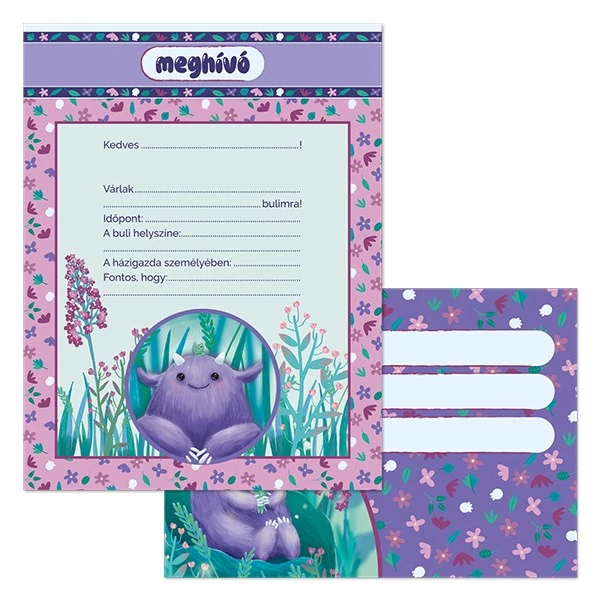 11 db különböző alkalomra használható partimeghívó lap és 10 db C/6 méretű, hozzáillő mintájú boríték egy csomagban. 80 gr-os, szép fehér ofszet papírra, négy szín nyomással készült. Golyóstollal és filccel is írható. Felakasztható, négy színnel nyomott fejléccel. A boríték postai szabványnak megfelelő méretű.
