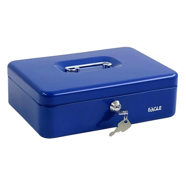 Egyszínű, fém, zárható pénzkazetta, műanyag, kiemelhető érmetartóval. Méret:100x217x300 mm